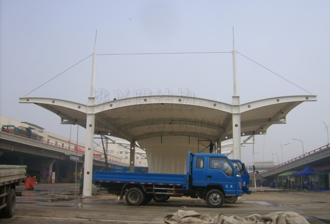 大巴、貨車膜結構車棚,一般來說車棚的沿高度以6m-10m為宜。大車車棚多是用作商貿中轉站,所以不能單單以車高來考量,還要利于裝卸貨方便,而且這樣的地方車輛品種會非常雜,所以建設時要盡量多的留出空間,要往高里建。