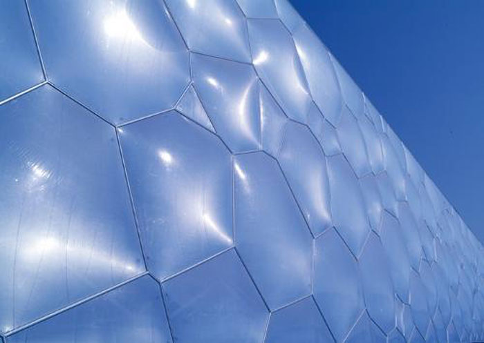 隨著膜材方面科學技術的不斷發展,目前的膜材耐久性可達25~30年,成為永久性建筑的良好選材。膜材厚度一般為1mm左右,它應用于建筑既是受力構件,又是維護構件,因此,膜材被譽為繼石材、木料、鋼材、玻璃和混凝土之后的“第六種建材”。ETFE(乙烯聚四氟乙烯)膜材則是一種全新型建筑膜材,它是一種聚合物擠出材料,各項性能均優于其他膜材產品,在耐火、耐久、透光等方面的性能與玻璃相當。應用ETFE膜材的膜氣枕系統其結構形式推陳出新,在結構、安全、可持續性等方面具有顯著的優勢。本文將就以下幾個方面給大家介紹一下ETFE膜氣枕系統的優點。