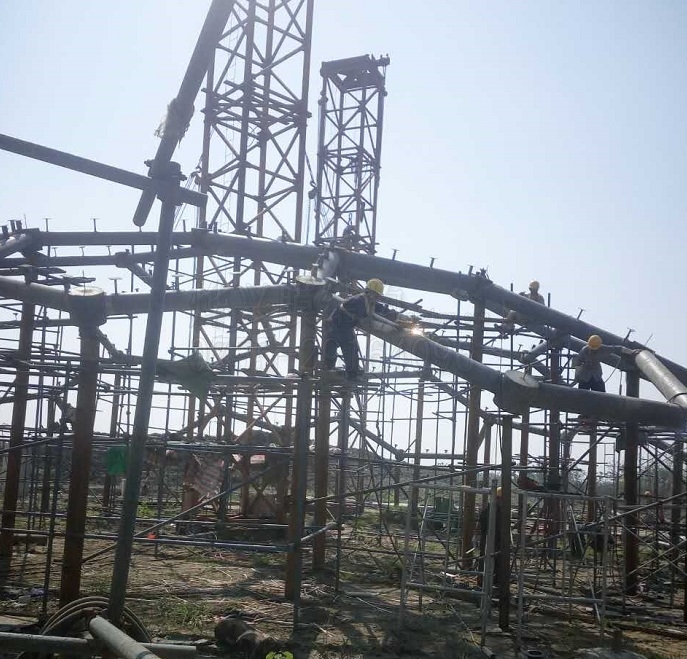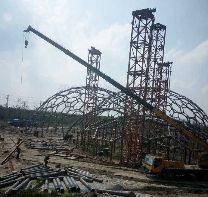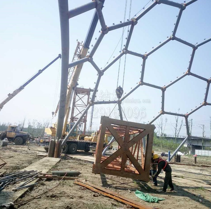 今天的工作任務(wù),主要分兩部分,主力繼續(xù)對三號球的鋼構(gòu)進行地面拼裝,剩余一隊人員負責(zé)對二號球鋼構(gòu)的支撐架進行拆解轉(zhuǎn)移,為三號球鋼構(gòu)吊裝做好準(zhǔn)備。連云港薔薇湖熱帶植物園一期工程三個半球形場館,目前已經(jīng)完成兩個半球的鋼構(gòu)完成拼裝,第三個已在地面完成三分之一量,即將準(zhǔn)備吊裝。