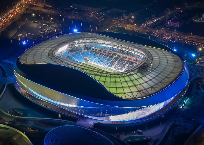 工程簡介:青島青春足球場是山東省首座五萬座專業足球場,滿足國際足聯國際A級比賽要求,是全國首個城站一體全民互動式公園化體育綜合體。青春足球場的設計靈感由海而來,取意“躍動海浪”。場館屋面外圈主體采用鋁鎂錳板勾勒塑造上下穿梭、飄逸流動的海浪造型,內圈則用透明輕盈的ETFE膜結構呼應青島優美的自然海岸風光,彰顯了青島開放、現代、活力、時尚的城市氣質。